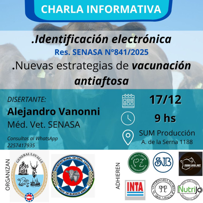 El próximo 17 de diciembre se realizará una charla informativa sobre identificación electrónica y nuevas estrategias de vacunación antiaftosa, en el marco de la Resolución SENASA N.º 841/2025.