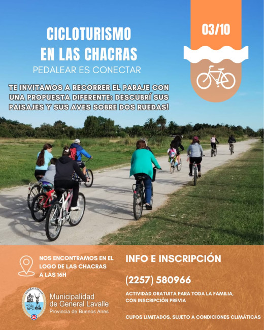 La Municipalidad de General Lavalle, a través de su Dirección de Turismo, invita a participar de una nueva jornada de cicloturismo en el Paraje Las Chacras. La actividad, pensada para toda la familia, combina naturaleza, recreación y actividad física.