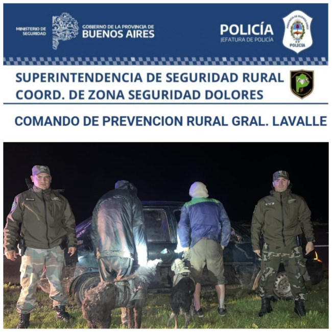 Personal del CPR General Lavalle identificó a dos ciudadanos que circulaban en un vehículo Chevrolet Corsa color verde por el terraplén del canal 2. En el interior del rodado se encontraban dos canes con chalecos similares a los utilizados para la caza de chanchos cimarrones.