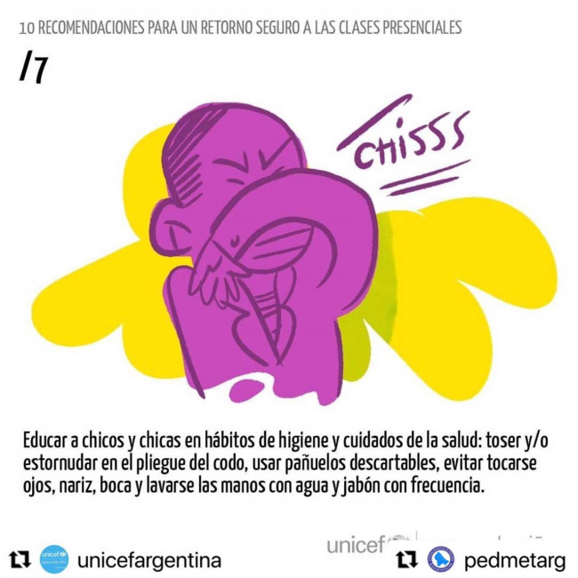 7) Educar a chicos y chicas en hábitos de higiene y cuidados de la salud: toser y/o estornudar en el pliegue del codo, usar pañuelos descartables, evitar tocarse ojos, nariz, boca y lavarse las manos con agua y jabón con frecuencia.
