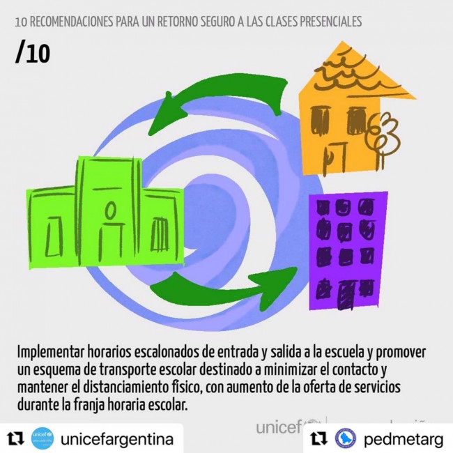 10) Implementar horarios escalonados de entrada y salida a la escuela y promover un esquema de transporte escolar destinado a minimizar el contacto y mantener el distanciamiento físico, con aumento de la oferta de servicio durante la franja horaria escolar.