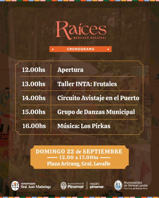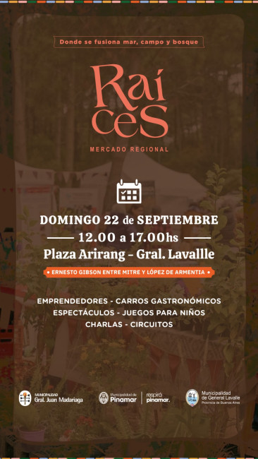 La Municipalidad de General Lavalle, a través del Área de Turismo informó que el domingo 22 de septiembre de 2024 se llevará a cabo en nuestra localidad el tercer “Mercado regional” en el marco del programa “Raíces”, propuesta que reúne a municipios vecinos bajo el lema: " donde se fusiona el mar, el campo y el bosque".