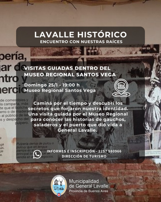 En el marco de las propuestas culturales y turísticas impulsadas durante la temporada, la Municipalidad de General Lavalle, a través de la Dirección de Turismo, invita a vecinos y visitantes a participar de “Lavalle Histórico – Encuentro con nuestras raíces”, una visita guiada que se desarrollará en el Museo Regional Santos Vega.