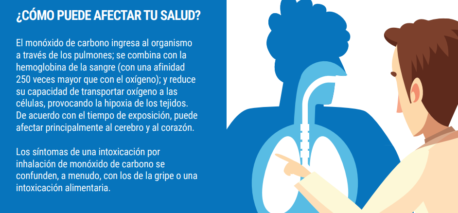El monóxido de carbono es un gas muy tóxico para las personas y los animales. Ingresa al organismo a través de los pulmones y desde allí pasa a la sangre, ocupando el lugar del oxígeno. Reduce la capacidad para transportar oxígeno de la sangre y hace que las células no puedan utilizar el oxígeno que les llega. La falta de oxígeno afecta principalmente al cerebro y al corazón.