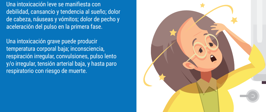 Se debe sospechar una intoxicación con monóxido de carbono cuando una o varias personas que estuvieron en un ambiente cerrado al mismo tiempo, presentan: dolor de cabeza, mareos, somnolencia, debilidad, cansancio, náuseas, vómitos, pérdida del conocimiento y/o convulsiones, palpitaciones, dolor de pecho o hasta paro cardiorrespiratorio.