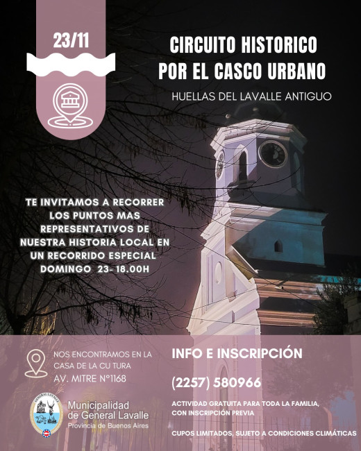 La Dirección de Turismo de la Municipalidad de General Lavalle realizará un Circuito Histórico por el casco urbano el domingo 23 de noviembre a las 18:00 horas. El punto de encuentro será la Casa de la Cultura, ubicada en Av. Mitre 1168.