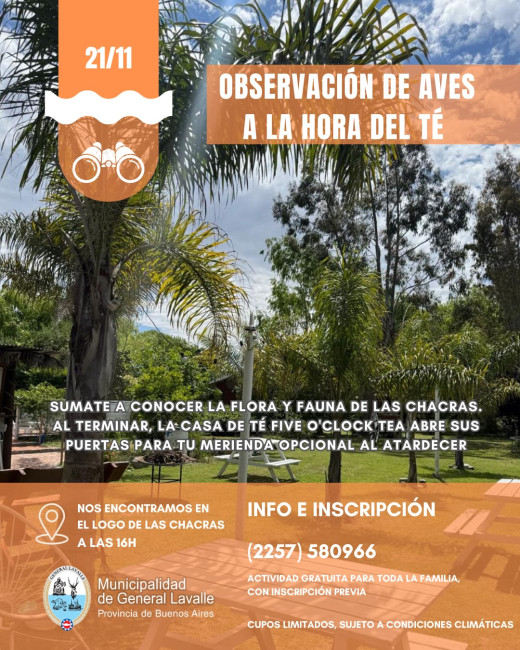 La Dirección de Turismo de la Municipalidad de General Lavalle anunció una nueva propuesta de contacto con la naturaleza: “Observación de aves a la hora del té”, que se realizará el viernes 21 de noviembre a las 16 horas en la localidad de Las Chacras.