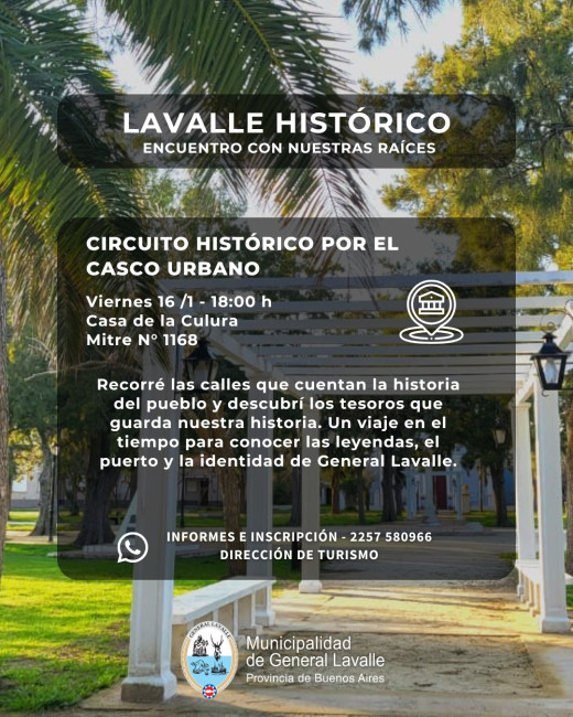 En el marco de la Agenda de Verano, la Municipalidad de General Lavalle, a través de la Dirección de Turismo, invita a vecinos y visitantes a participar de “Lavalle Histórico – Encuentro con nuestras raíces”, un circuito guiado por el casco urbano que propone redescubrir la historia, la identidad y el patrimonio local.