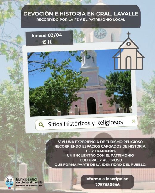 La Municipalidad de General Lavalle, a través de la Dirección de Turismo, convocó a la comunidad y a los visitantes a participar de la propuesta “Devoción e Historia en General Lavalle”, un circuito guiado destinado a redescubrir la riqueza cultural, histórica y religiosa del distrito. La actividad se realizará el jueves 2 de abril a las 15:00 horas.