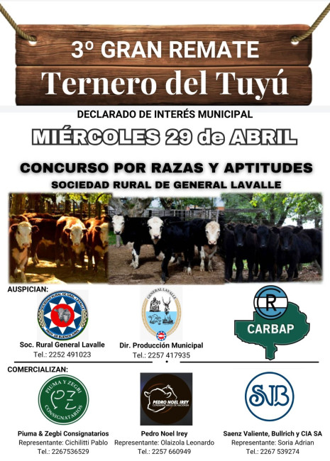 Como ya se está convirtiendo en una tradición en nuestro Lavalle, se realizará el 3º Gran Remate “Ternero del Tuyú”, declarado de Interés Municipal. En esta nueva edición se mostrará parte de nuestra producción ganadera, destacando la calidad de los terneros criados en el partido, reconocidos por sus distintas razas y excelente aptitud productiva.