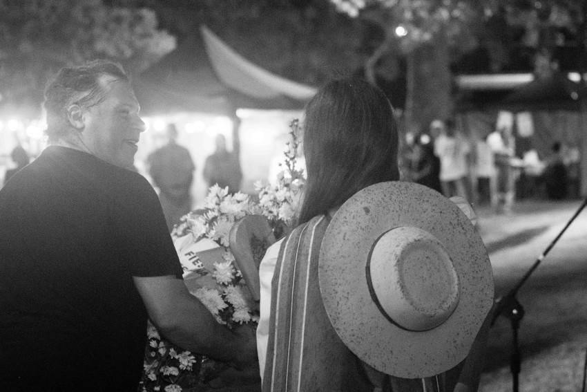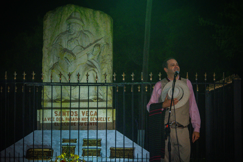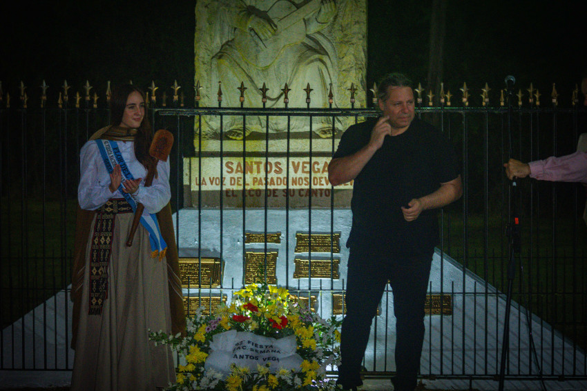 Luego, junto a la Flor del Pago Catalina Echarren, Guardia colocó una ofrenda floral a los pies del Monumento a Santos Vega y ambos recorrieron el predio de la fiesta para saludar a los feriantes que apostaron a estar presentes en esta nueva edición.