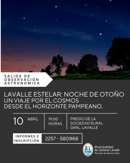 La Dirección de Turismo de General Lavalle invita a la comunidad y a los visitantes a participar de la actividad “Noche de Otoño”, una propuesta de astroturismo que se llevará a cabo el próximo viernes 10 de abril a las 19:00 horas en el predio de la Rural.