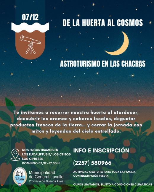 La Dirección de Turismo de la Municipalidad de General Lavalle presentó “De la Huerta al Cosmos – Astroturismo en Las Chacras”, una actividad gratuita orientada a toda la familia que integra saberes productivos, aromas y sabores locales, y una experiencia nocturna bajo el cielo estrellado.