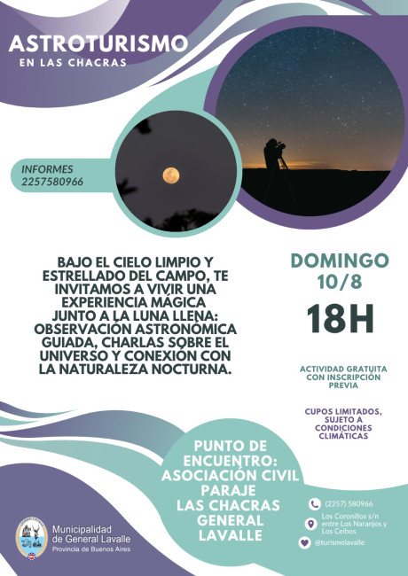El domingo 10 de agosto a las 18:00 horas se desarrollará una experiencia única bajo el cielo estrellado del campo, en coincidencia con la luna llena. La actividad incluye observación astronómica guiada, charlas sobre el universo y momentos de conexión con la naturaleza nocturna.