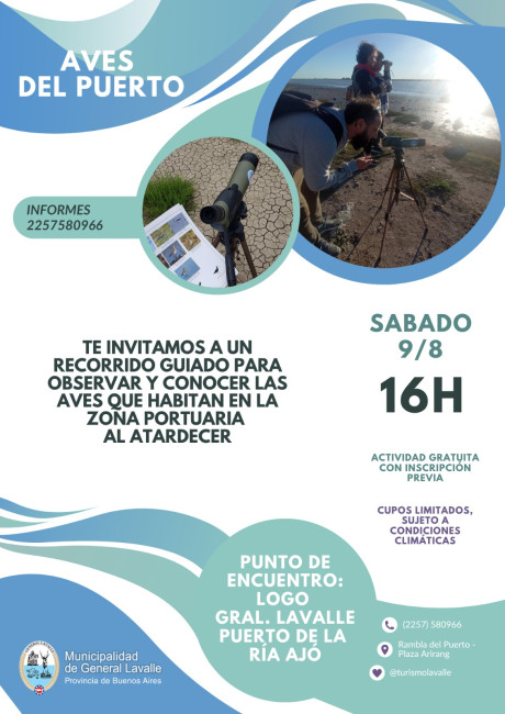 El sábado 9 de agosto a las 16:00 horas se llevará a cabo una caminata guiada para observar y conocer las distintas especies de aves que habitan en la zona portuaria al atardecer. Esta propuesta está dirigida a toda la familia y tiene como objetivo fomentar el interés por la biodiversidad local y la conciencia ambiental.