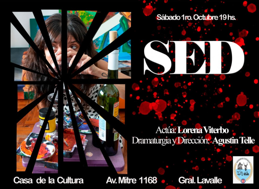 La Municipalidad de General Lavalle, a través de la Secretaría de Cultura informó que el sábado 1 de octubre de 2022 presentará la obra de teatro unipersonal “Sed” en la Casa de la Cultura, ubicada en Avenida Mitre 1168.