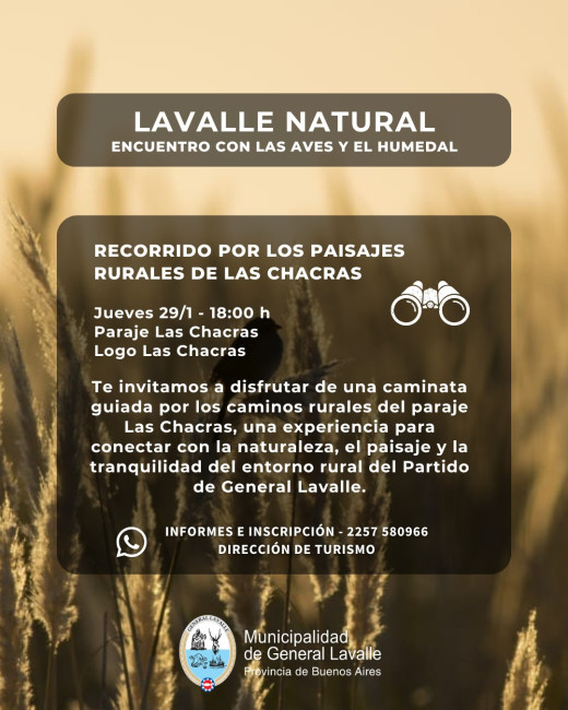 La Municipalidad de General Lavalle, a través de la Dirección de Turismo, invita a la comunidad y a visitantes a participar de una nueva propuesta del programa Lavalle Natural, que consiste en un recorrido guiado por los paisajes rurales del paraje Las Chacras.