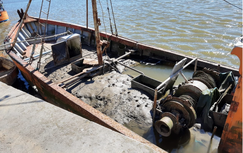 Finalizaron los trabajos de reflotamiento del casco de la embarcación pesquera “Nva. Virgen de Luján” que fue trasladado a la ribera opuesta al frente de amarre local para su disposición final junto con los restos de otros cascos en desuso y/o en estado de abandono.
