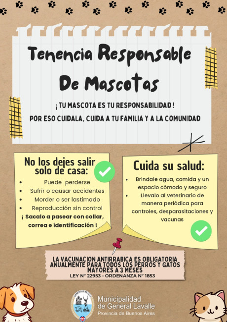 El municipio lanzó una campaña de concientización sobre tenencia responsable de mascotas, con el objetivo de fomentar el cuidado adecuado de perros y gatos y prevenir situaciones que afecten su bienestar y el de la comunidad. El mensaje principal apunta a reforzar que cada mascota es responsabilidad de su tutor y requiere atención, control y acompañamiento.