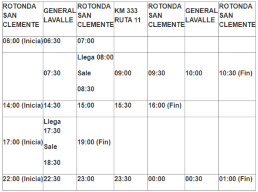 La Municipalidad de General Lavalle informó que desde el 2 de enero de 2024 el servicio del transporte público entre Lavalle-San Clemente y Pavón-Mar de Ajó ya funciona de lunes a lunes, es decir, todos los días, para aquellas personas que necesiten movilizarse para trabajar durante la temporada de verano e inclusive hasta el fin de semana santa.
