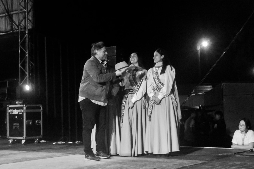 La nueva corte recibió los atributos de manos de los organizadores: Nahuel Guardia fue quién le llevó el sombrero característico y la saliente Flor del Pago Catalina Echarren entregó el bastón.